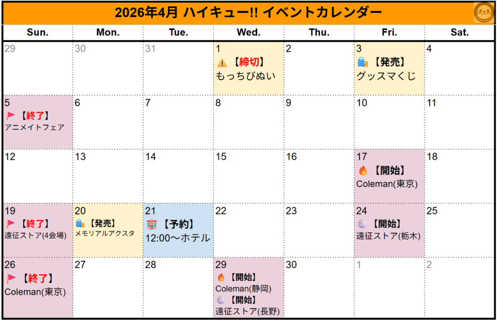 | 4/26(日) | 終了 | Coleman× ハイキュー!! POP UP | 東京会場 最終日 |