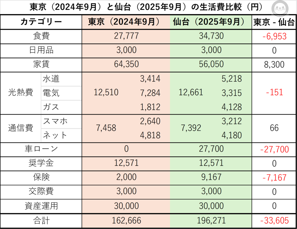 私の移住してからの実際の生活費を東京(2024年9月)と仙台(2025年9月)で比較してみました。