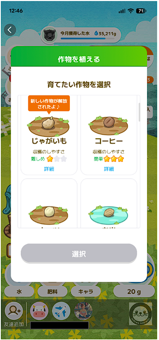 フレンドの作物に「あいさつ」をすると水を12~15g獲得することができます。さらに、フレンドの作物に水を1回あげることで肥料を2獲得することができます。