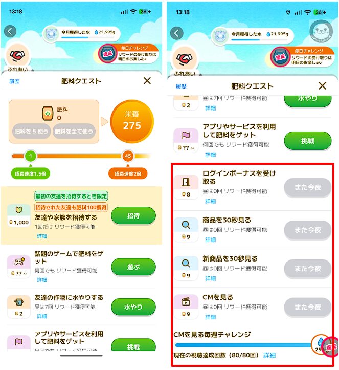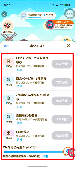 これらのミッションは大きな稼ぎ頭になるため、積極的に挑戦しましょう。「CMを見る」チャレンジは一週間以内に80回クリアすると、ボーナスで更に水を追加でもらえるので、積極的にチャレンジしましょう。