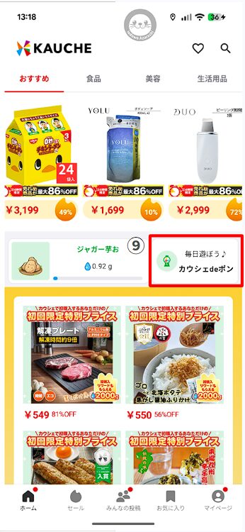 「カウシェファーム」のページではなく「カウシェのホーム」から「カウシェdeポン」でくじを引くことができます。運が良ければ水や肥料を獲得することができます。